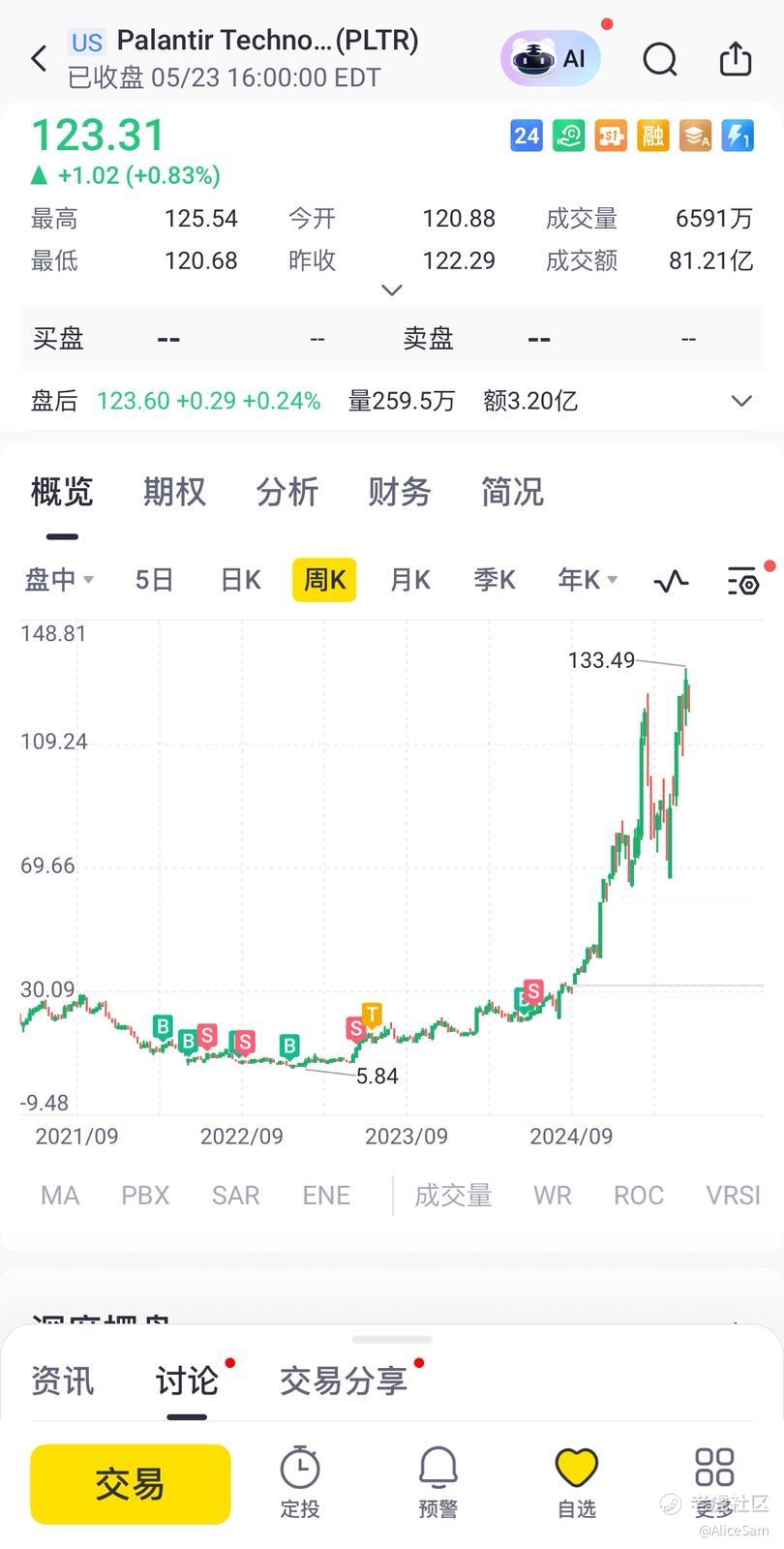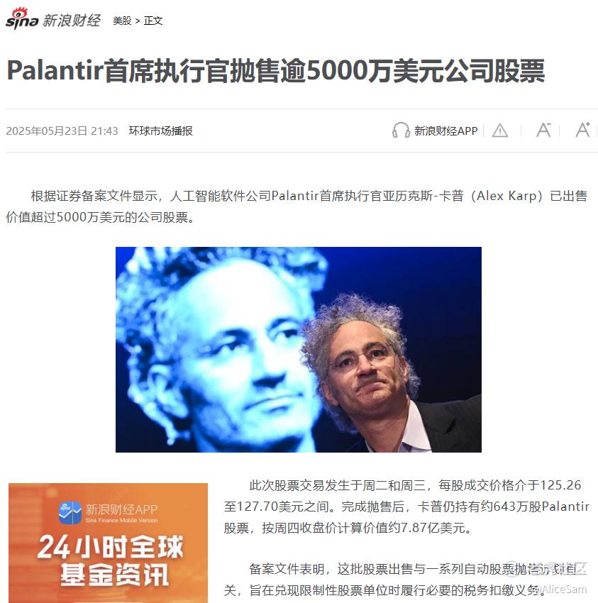 其实我当初买的Palantir就给过我一个赚大钱的机会,我可是当年他5块多6块多就持有重仓的,可惜我没有把握住,在 $Palantir Technologies Inc.(PLTR)$ 涨到10几块的时候,就清仓止盈了,然后眼睁睁的看着他成为10倍股。不知道现在他们首席执行官Alex Karp抛售价值超过5000万美元,会不会也是一次太早的止盈呢。他这次抛售的每股成交价格介于125.26至127.70美元之间,等PLTR到300一股的时候,他可能也会有我一样的遗憾吧 [捂脸] 。