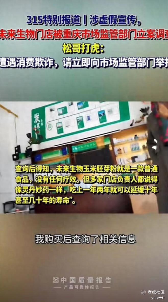 2024年“3·15”期间,未来生物被多家媒体曝光,重庆渝北区市场监管局对其虚假宣传正式立案。此外根据媒体曝光,其直销牌照仅限销售一款保健食品“胚元牌元诺胶囊”,但实际通过线上商城及会议销售多款未备案产品(如玉米胚芽粉),涉嫌超范围经营,违反《直销管理条例》。