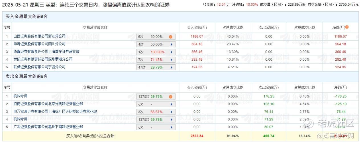 5月21日,山西证券浙江分公司买入1186.07万元,申港证券四川分公司买入564.18万元,炒股养家买入366.46万元,世纪证券深圳罗湖买入联储证券宁波分公司买入292.48万元,124.35万元;卖出席位中,机构专用卖出176.25万元,招商证券北京光明路卖出125.10万元,申万宏源上海徐汇区天钥桥路卖出76.44万元,广发证券惠州下埔路卖出50.67万元。整体来看,买入力量较强。