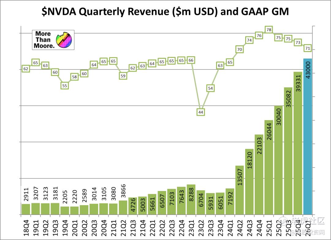 我们可以先看最关键的一项——营收增长的绝对值和环比速度。上季度营收是393亿美元,这一季指引430亿美元,环比增长只有37亿,增幅大概是9.4%。 这个数字放在别的公司可能还不错,但对英伟达这种动辄季度增长15%、20%的表现来说,就显得偏保守了。