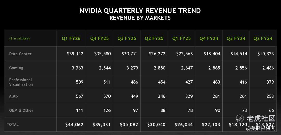 本季度,英伟达实现营收441亿美元,同比大增69%,远高于去年同期的260亿美元,也高于市场预期的431亿美元。净利润为188亿美元,较去年同期的149亿美元增长26%;调整后每股收益达到0.96美元,超过分析师普遍预期的0.93美元。毛利率为61%,若剔除与中国相关的库存计提,实际毛利率高达71.3%。