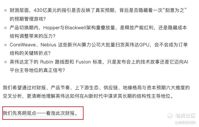 在 $英伟达(NVDA)$ 多重复杂宏观因素的前提下,我们美股投资网通过大量分析,勇于给大家预判。在我们美股投资网昨天公众号发布的5000字深度文章《英伟达5月财报预测,深度分析报告》中,我们非常明确地表明了我们的观点:坚定看涨。