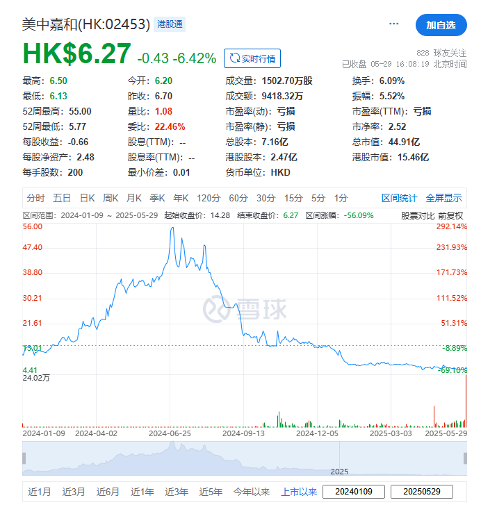 截至周四(5月29日)收市,美中嘉和(02453.HK)每股收报6.27港元,总市值约44.91亿港元。