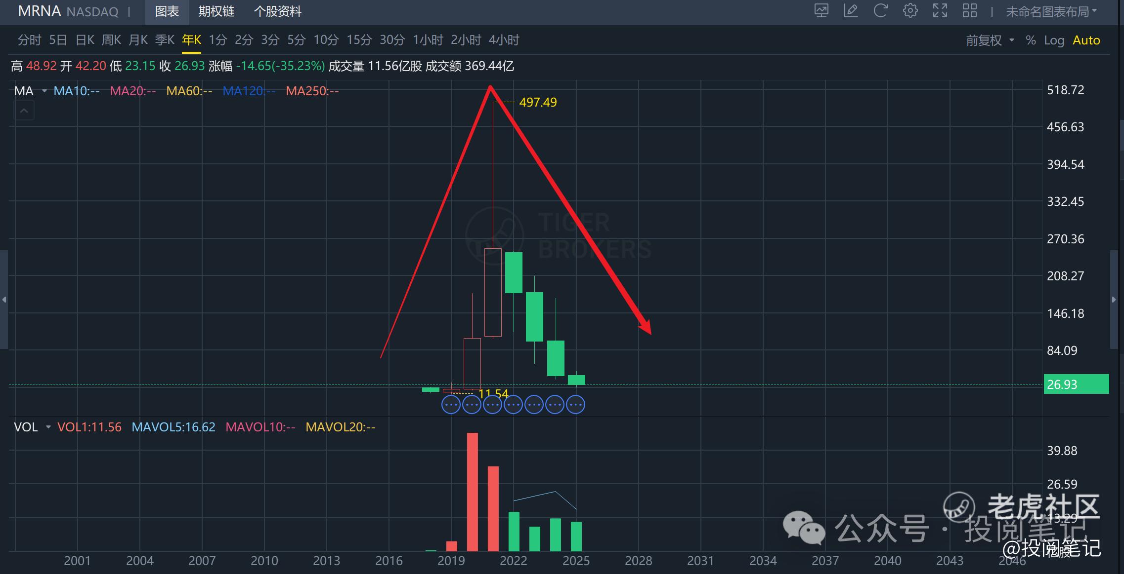 关于莫德纳我想多说几句,该公司在2020年7天就开发出来了新冠疫苗,所以股价在2020年+434.10%,2021年+143.11%,最高市值过千亿,但是就在这之后股价暴跌:2022年-29.28%,2023年-44.63%,