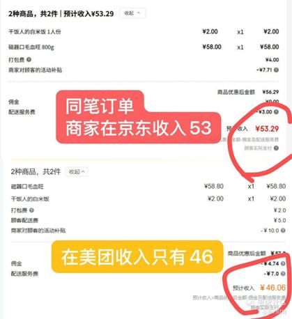 另外一位商家晒出的后台订单截图也显示,同一笔订单,在京东外卖能收入53.29元,而在美团外卖只能收到46.06元。