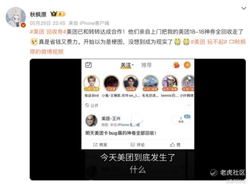 昵称为“秋枫原”的博主在微博上调侃:美团已和转转达成合作!他们亲自上门把我的美团18-18神券全回收走了,真是省钱又费力。开始以为是梗图,没想到成为现实了。