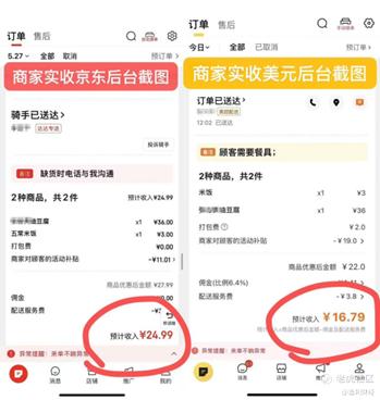 有商家同时晒出了京东和美团的订单对比,一单商品原价39元的美团外卖订单,商家需补贴19元,扣除佣金和配送服务费,实收只有16.79元,平台收取费用22.21元,平台抽成占订单金额高达61%。同样商品金额的订单,在京东外卖平台的实收为24.99元,比美团收入多出8.2元。
