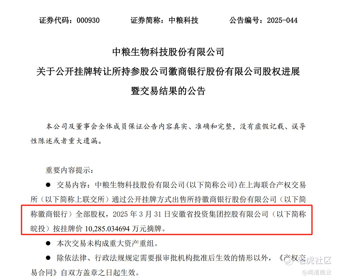 自2024年12月起,中粮旗下中粮生物科技便开始计划转让所持有的徽商银行4030.95万股股份,占徽商银行总股本的0.29%,定价1.56亿元。与此同时,中粮集团挂牌转让徽商银行3810.75万股股份,约占徽商银行总股本的0.27%,定价1.48亿元。这两个挂牌合计3.04亿元。