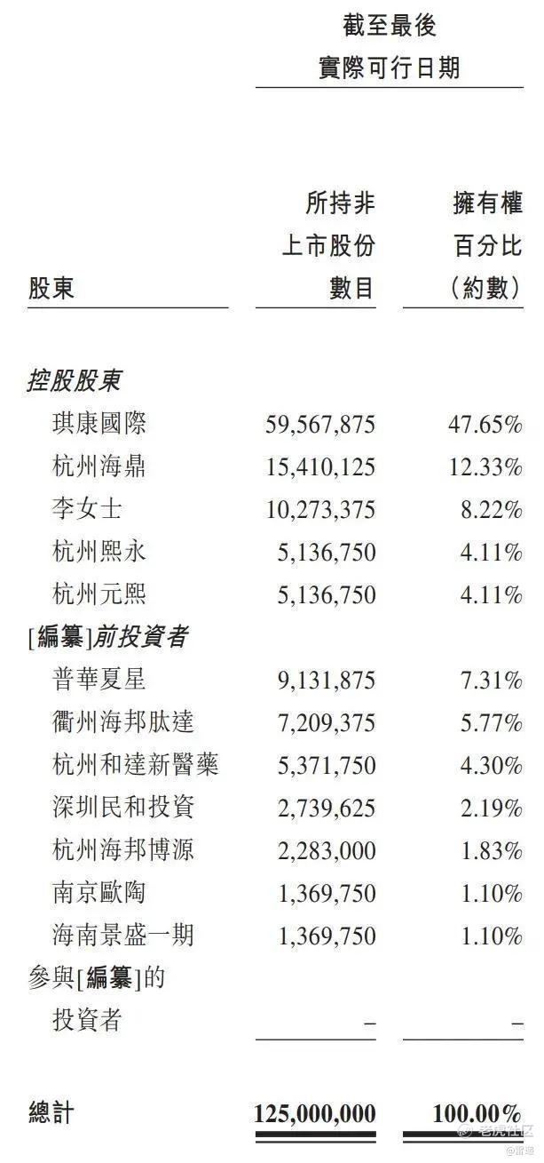 IPO前,徐琪博士通过琪康国际持股为47.65%,杭州海鼎持股为12.33%,李湘莉女士持股为8.22%,杭州熙永、杭州元熙分别持股为4.11%;