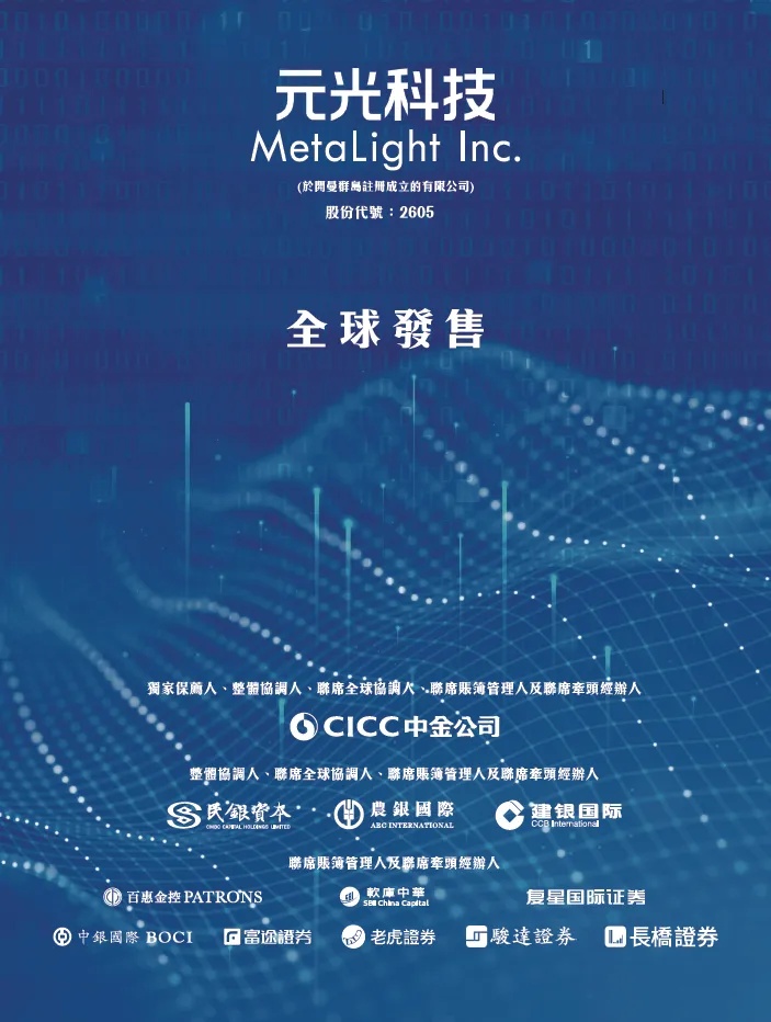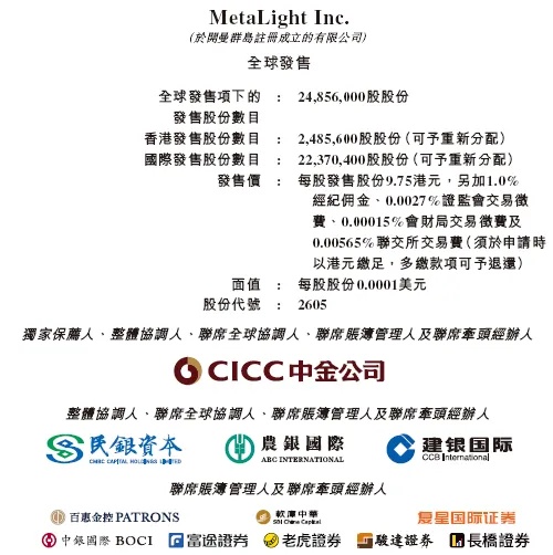METALIGHT是次IPO,中金公司为其独家保荐人、整体协调人、联席全球协调人,民银证券、农银国际、建银国际为其整体协调人、联席全球协调人,其他包销商包括百惠证券、软库中华、复星国际证券、中银国际、富途证券、老虎证券、骏达证券、**证券。