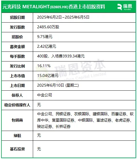 来自湖北武汉的元光科技 METALIGHT(02605.HK),于周一(6月2日)起至周四(6月5日)招股,预计2025年6月10日在港交所挂牌上市,中金公司独家保荐。