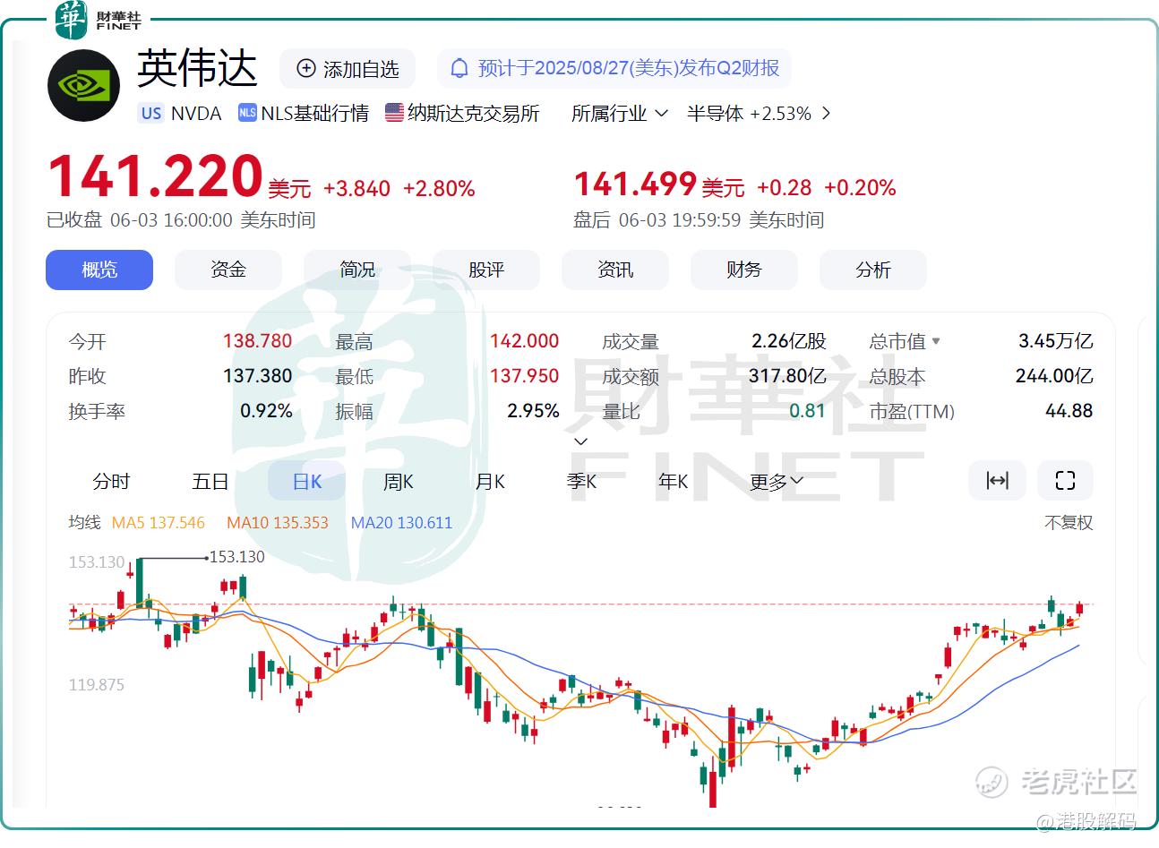 当地时间6月3日,美股的AI总龙头 $英伟达(NVDA)$ 大涨2.8%,报141.22美元/股,公司市值升至约3.45万亿美元,超越微软重夺全球市值第一头衔。