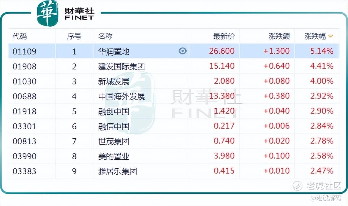 6月5日,港股地产板块集体走高。截至发稿前, $华润置地(01109)$ 涨5.14%, $建发国际集团(01908)$ 涨4.41%, $新城发展(01030)$ 涨4%, $中国海外发展(00688)$ 涨2.92%,融创中国(01918.HK)涨2.9%,世茂集团(00813.HK)、美的置业(03990.HK)、雅居乐集团(03383.HK)等均涨。