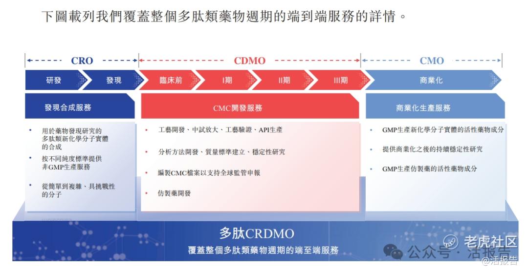 公司主要提供(i)合约研究机构(「CRO」)服务,即多肽新化学分子实体(「NCE」)发现合成;(ii)合约开发及生产机构(「CDMO」)服务,即多肽化学、制造及控制(「CMC」)开发;及(iii)合约生产机构(「CMO」)服务,即多肽NCE及仿制药商业化生产。