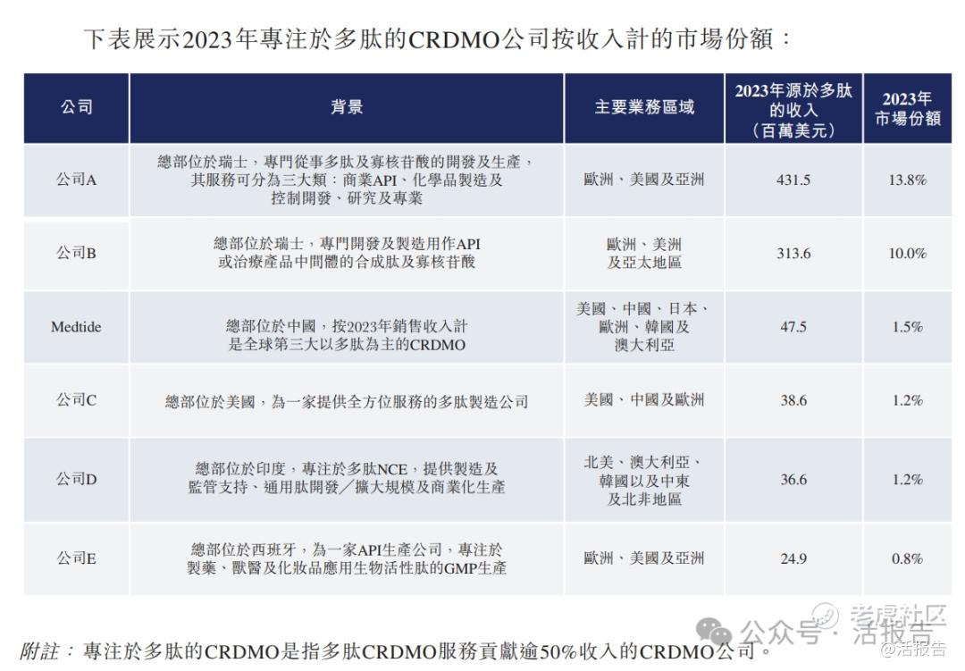 根据弗若斯特沙利文的资料,就2023年销售收入而言,公司是全球第三大专注于多肽的合约研究、开发及生产机构(「CRDMO」)。根据弗若斯特沙利文的资料,公司亦是全球专注于多肽的最全面的CRDMO之一,提供从早期发现、临床前研究及临床开发以至商业化生产的全周期服务。