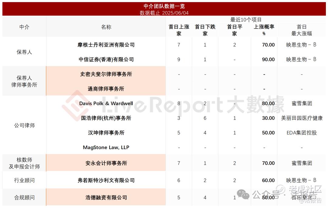 据LiveReport大数据统计,泰德医药中介团队共计11家,其中保荐人2家,近10家保荐项目数据表现优秀;公司律师4家,综合项目数据一般。整体而言中介团队历史数据表现勉强可以。