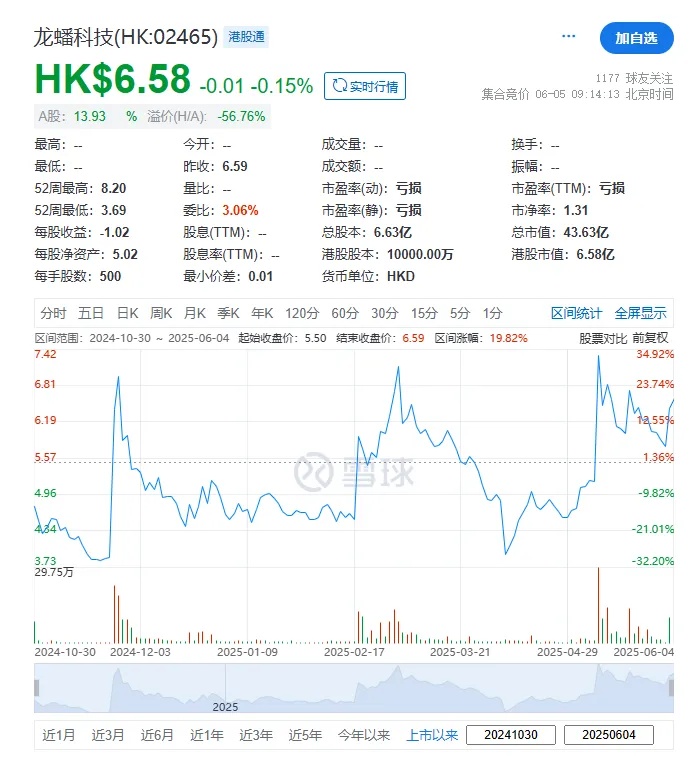 龙蹯科技(02465.HK),于2024年10月30日在港交所上市,截至周三(6月4日)收市,每股