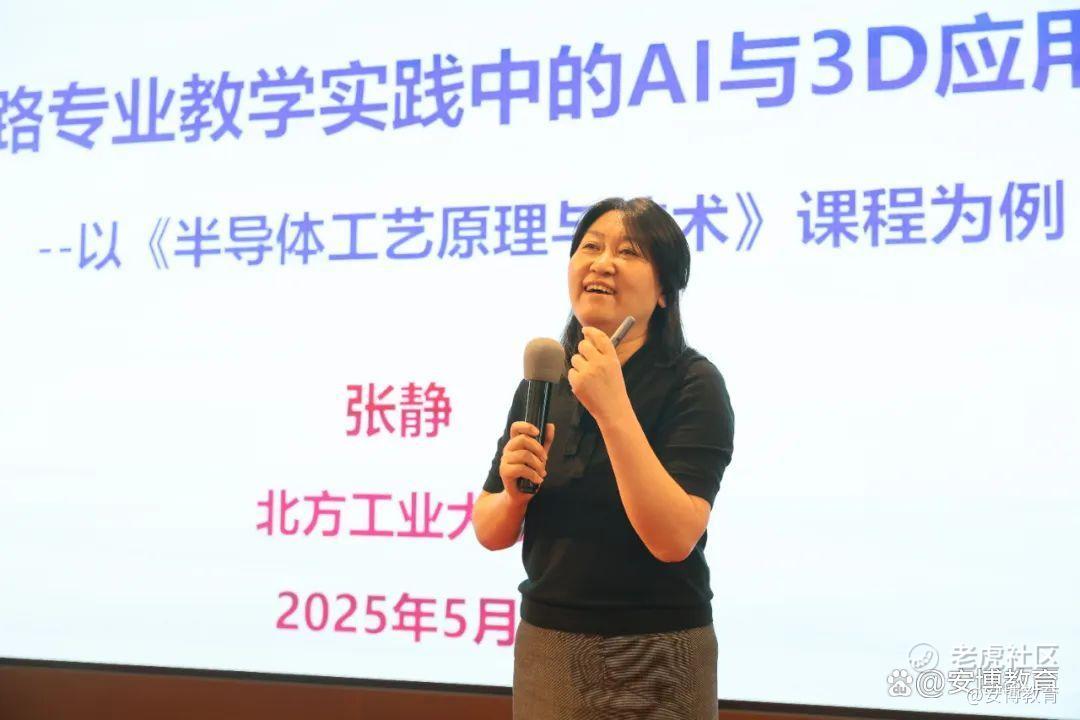 北方工业大学集成电路学院副院长张静教授以《集成电路专业教学与实践中的AI与3D应用案例》为主题,分享了北方工大在集成电路领域的人才培养模式以及新一代信息技术在工科专业教学中的创新应用。谈及教学创新,她表示,通过安博AI+3D数智平台辅助教学,解决理论课程与行业前沿脱节问题;3D直播技术赋能教学,直观展示复杂工艺流程,提升学生学习兴趣与参与度;开放实验强化教学,让学生在实践中深化理论理解。她说,这不仅是教学工具的革命,更是教育理念的升维,当教室与晶圆厂的无形之墙被技术击穿,教育才能真正成为产业创新的源头活水。