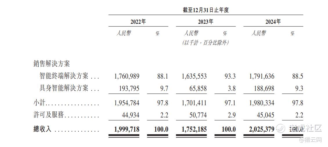 其中,来自智能终端解决方案销售的收入分别为17.61亿元、16.36亿元及17.92亿元,分别占同年总收入的88.1%、93.3%及88.5%;来自具身智能解决方案销售的收入分别为1.94亿元、0.66亿元及1.89亿元,分别占同年总收入的9.7%、3.8%及9.3%。该两项产品的销售额占比超过97%。