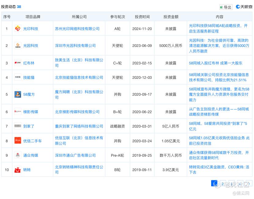 天眼查App信息显示,58同城迄今共对外投资(或并购)38起,目前管理北京五八信息技术有限公司、天津五八到家生活服务有限公司两家基金,另有12起对外投资基金记录。