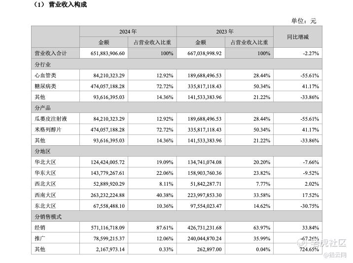 其中,易明医药的核心产品米格列醇片,在我国治疗2型糖尿病的米格列醇制剂市场中,所占的市场份额连年稳居首位。2024年报显示,易明医药米格列醇片收入约4.74亿元,占营业收入比重高达72.72%;瓜蒌皮注射液收入约8421.03万元,占比为12.92%。