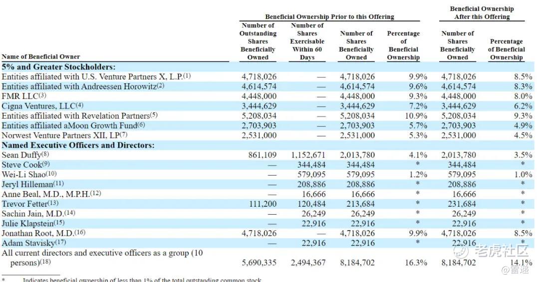 IPO前,U.S. Venture Partners X持股为9.9%,Andreessen Horowitz持股为9.7%,FMR持股为9.3%,Cigna Ventures持股为7.2%,Revelation Partners持股为10.9%,aMoon Growth Fund持股为5.7%,Norwest Venture Partners XII持股为5.3%,Sean Duffy持股为4.1%,Wei-Li Shao持股为1.2%,Jonathan Root, M.D.持股为9.9%。