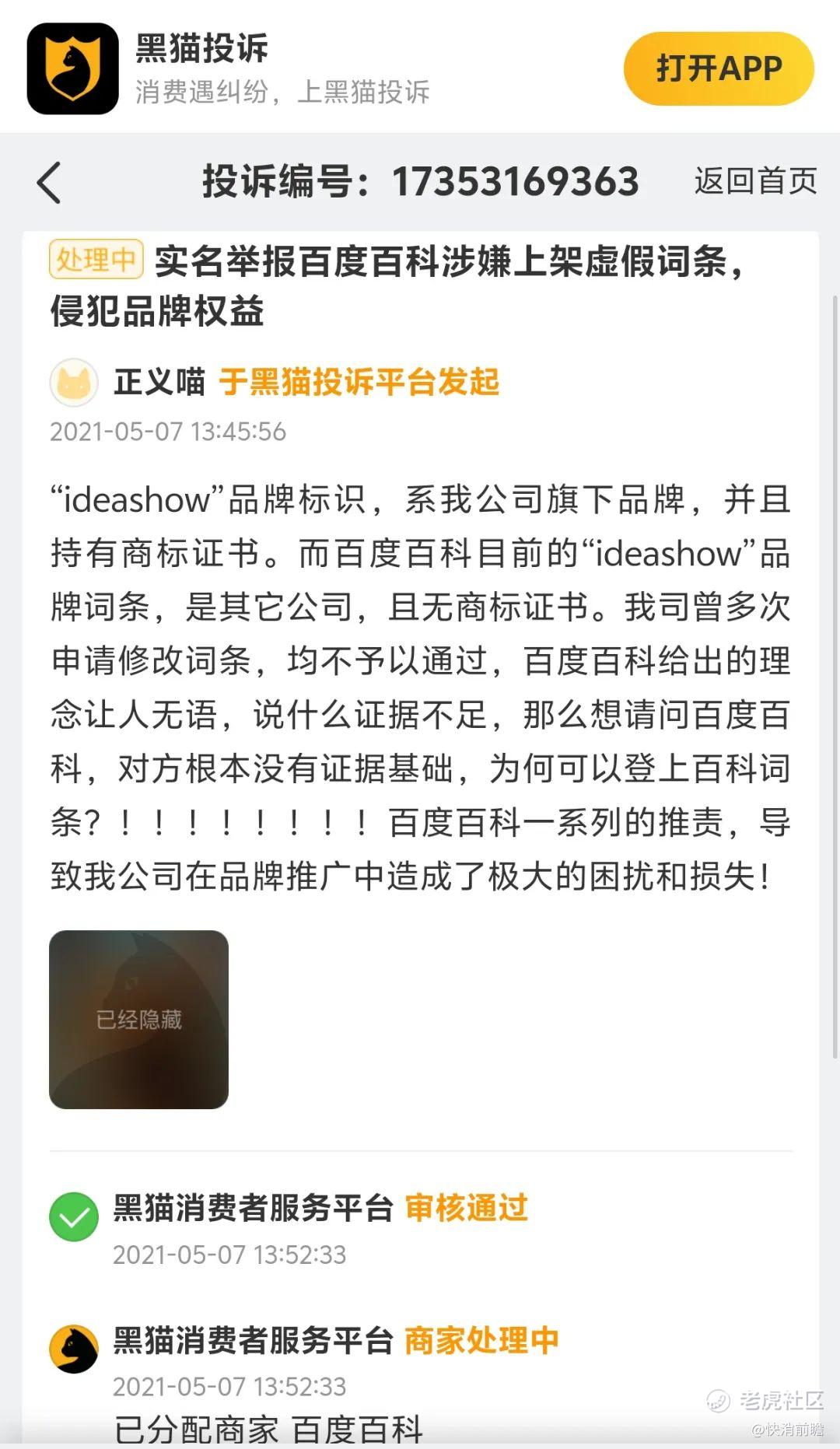 除此之外,还有网友投诉百度百科“涉嫌上架虚假词条,侵犯品牌权益”,该网友表示自己公司旗下持有商标证书的品牌标识,在百度百科词条显示却是其它公司,且无商标证书。该网友称其公司曾多次申请修改词条,均不予以通过,百度百科给出的理由是证据不足。该网友表示对方没有证据基础,为何可以登上百科词条。