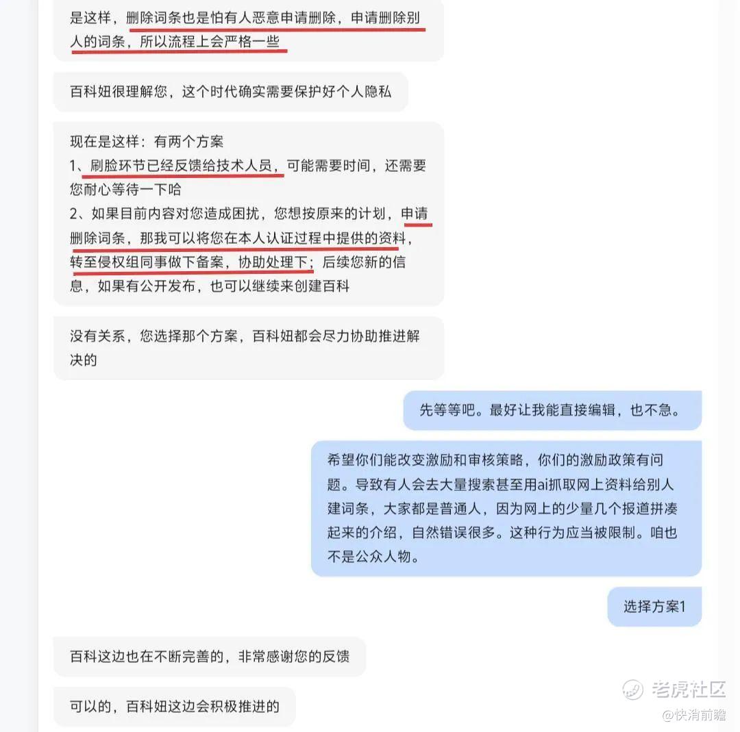 6月6日,百度百科客服对朱先生表示,删除词条流程繁琐是因为担心有人恶性删除,刷脸的环节已经反馈给技术人员,如果目前词条内容对朱先生造成困扰,需要删除的话,将转至侵权组同事做备案,协助处理。