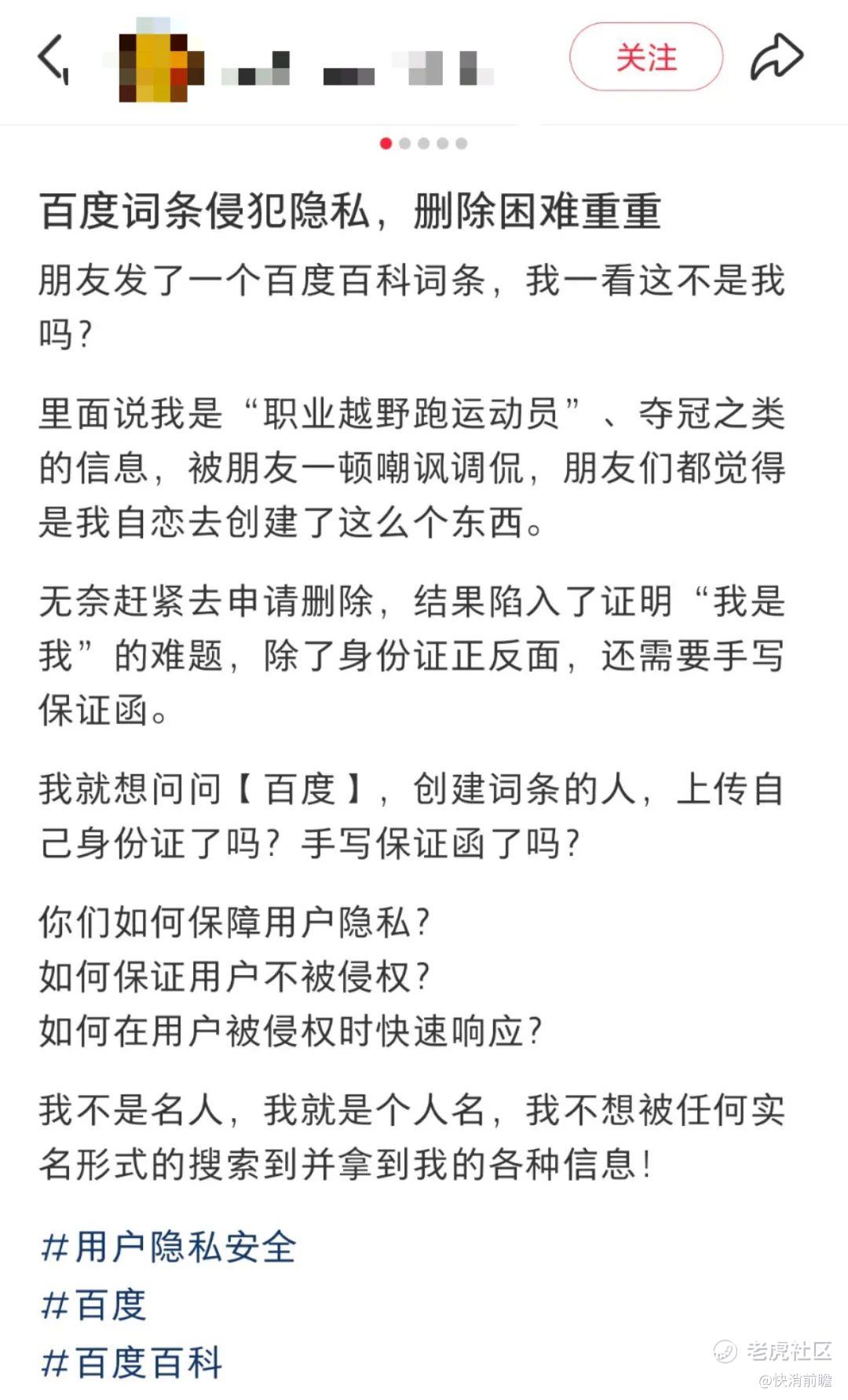 在小红书平台,有网友称“百度词条侵犯隐私,删除困难重重”,表示自己莫名其妙在百度百科有不符合自己信息的词条,申请删除不仅需要身份证正反面、还需要手写保证函和人脸识别认证来“证明我是我”。该网友认为自己的个人隐私和信息权利受到侵害,随后该网友向当地12345进行了相关投诉,但并未有何进展。