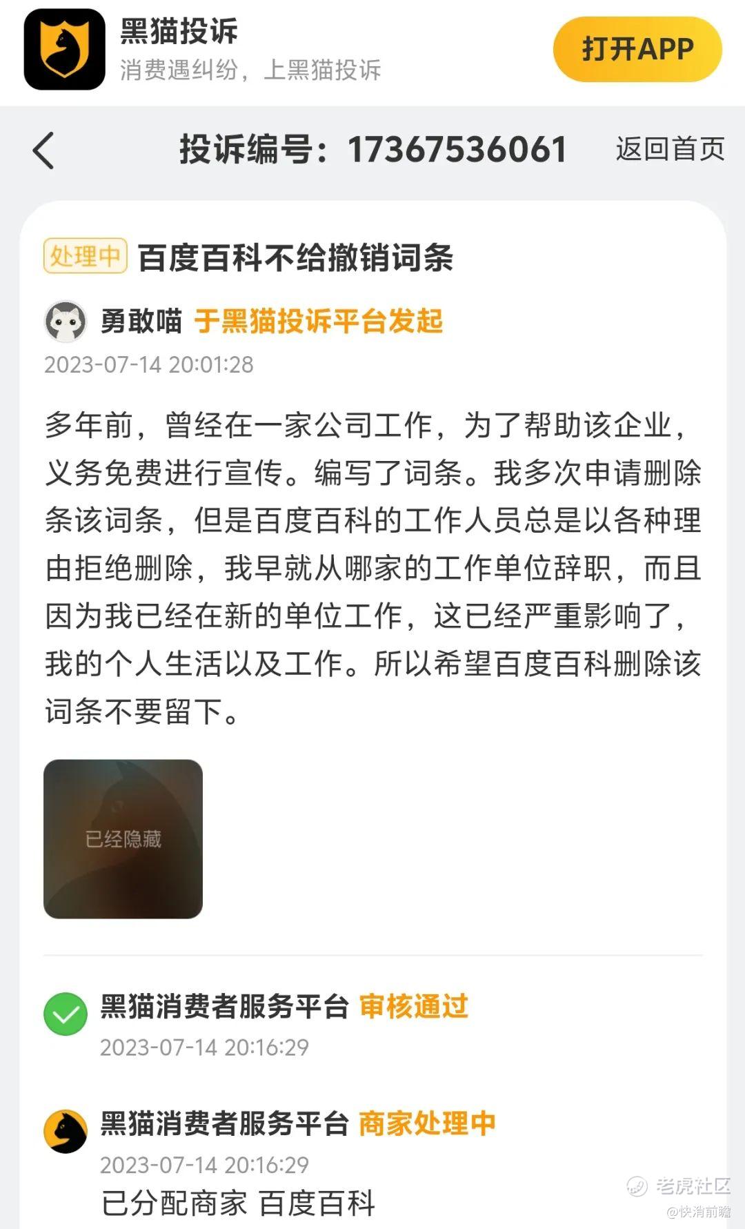 在黑猫投诉平台,也有网友投诉称,自己在多年前曾经在一家公司工作,为了帮助该企业,义务免费进行宣传编写了词条。然而多次申请删除条该词条,百度百科的工作人员总是以各种理由拒绝删除,该网友表示自己早就从那家工作单位辞职,而且由于自己目前在新的单位工作,已经严重影响了个人生活以及工作。