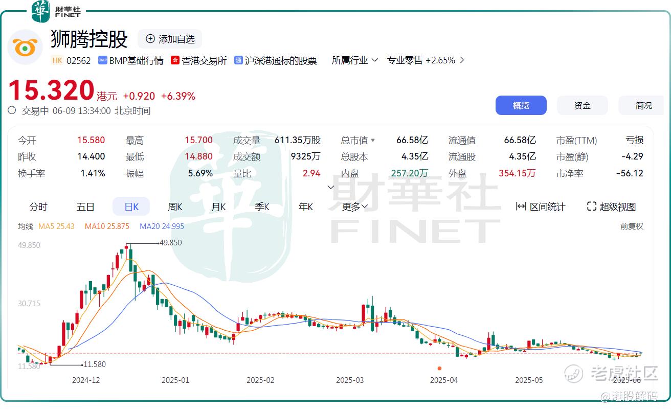 6月9日, $狮腾控股(02562)$ 开盘大幅走高,一度涨逾8.19%,随后震荡回落,截至发稿涨幅为6.39%,报15.32港元/股。