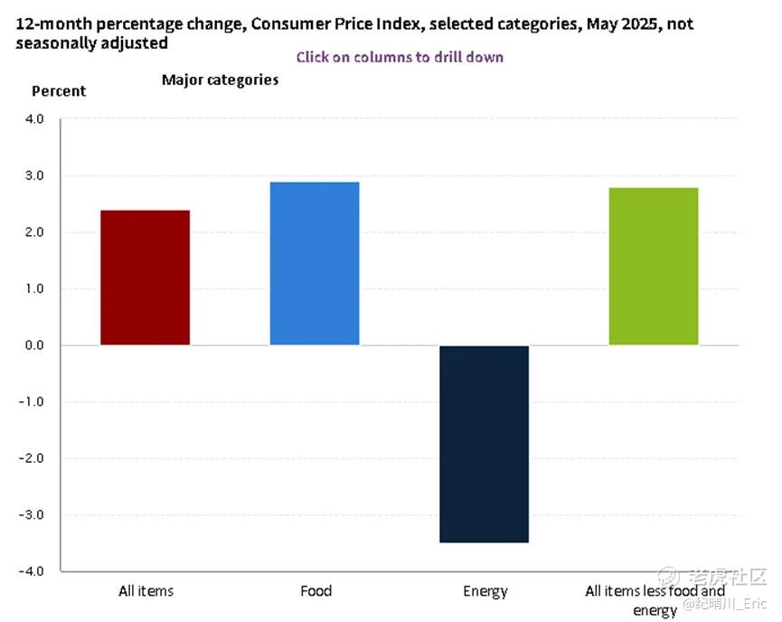 能源价格的下跌是抑制通胀的主要因素之一。5月能源指数环比下降1%,其中汽油价格下跌2.6%,天然气价格也有所回落,但电力成本上涨0.9%。与此同时,部分商品价格出现显著波动:受关税影响,香蕉价格上涨3.3%,玩具价格攀升2.2%,而鸡蛋价格则下跌2.7%。汽车和服装价格的下降则进一步拉低了核心CPI的读数。