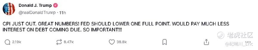 美国总统特朗普在CPI数据公布后再次敦促美联储大幅降息。他在社交媒体上以全大写字母发文称:“消费者物价指数刚刚公布,数据很棒!美联储应该降息一个百分点。这样到期的债务利息就会少很多。这太重要了!!!”