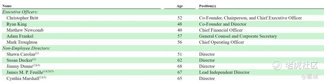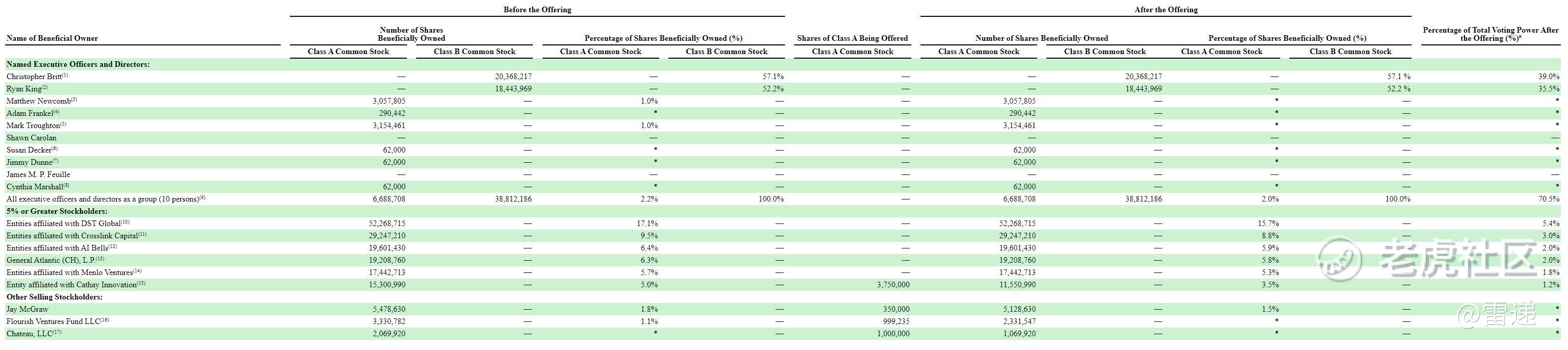 IPO后,Christopher Britt有57.1%的A类股,及39%的投票权,DST Global持有15.7%的A类股,有5.4%的投票权;Crosslink Capital持有8.8%的A类股,3%的投票权;AI Bells持有5.9%的A类股,及2%的投票权;