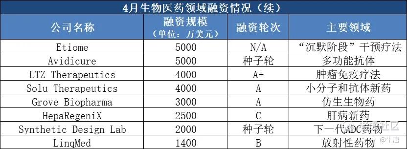 自免领域仍是热点:4月,多家自免药企获得大额融资,如融资1.21亿美元的Merida Biosciences、1.1亿美元的RayThera、1亿美元的Granite Bio、9000万美元的Attovia Therapeutics等;