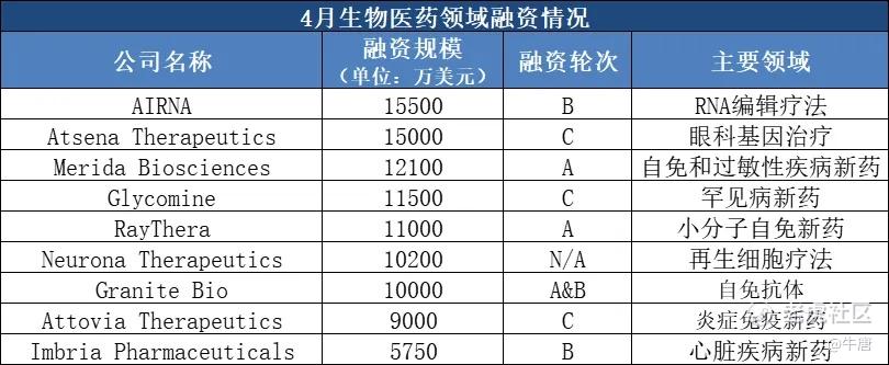 前沿技术路线与新靶点受到关注:4月,新一代RNA编辑疗法公司抑制剂公司AIRNA 、眼科基因疗法公司Atsena、CNS药物公司Neurona、心脏病药企Imbria 等前沿技术公司均获得大额融资。