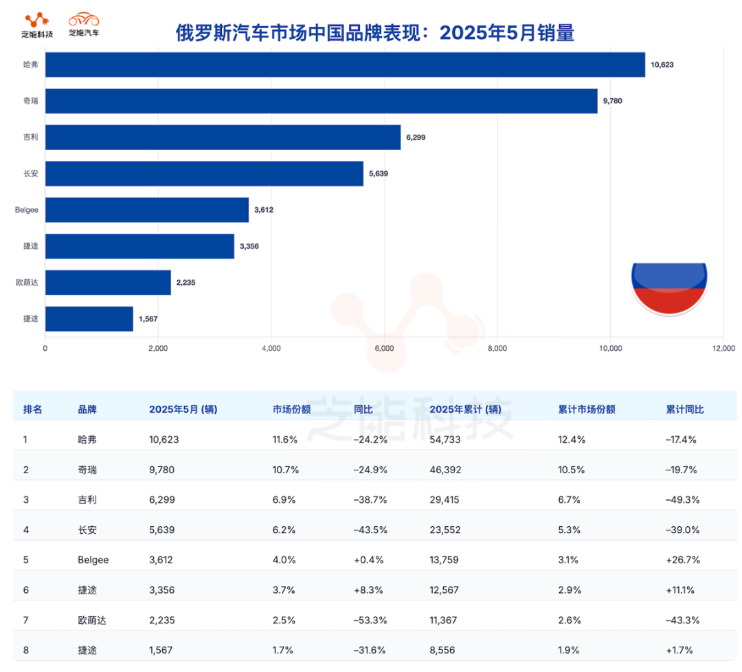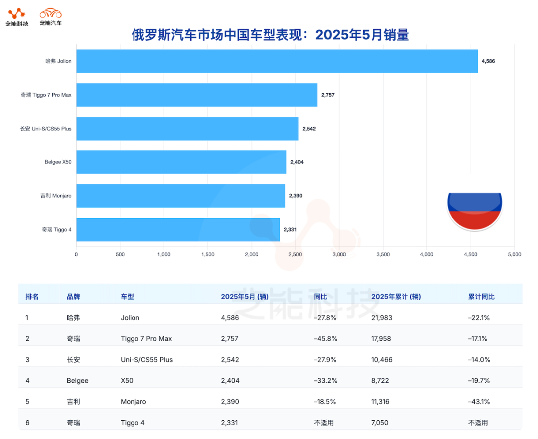 2025年5月,俄罗斯整体车市持续低迷,但中国品牌表现还行。