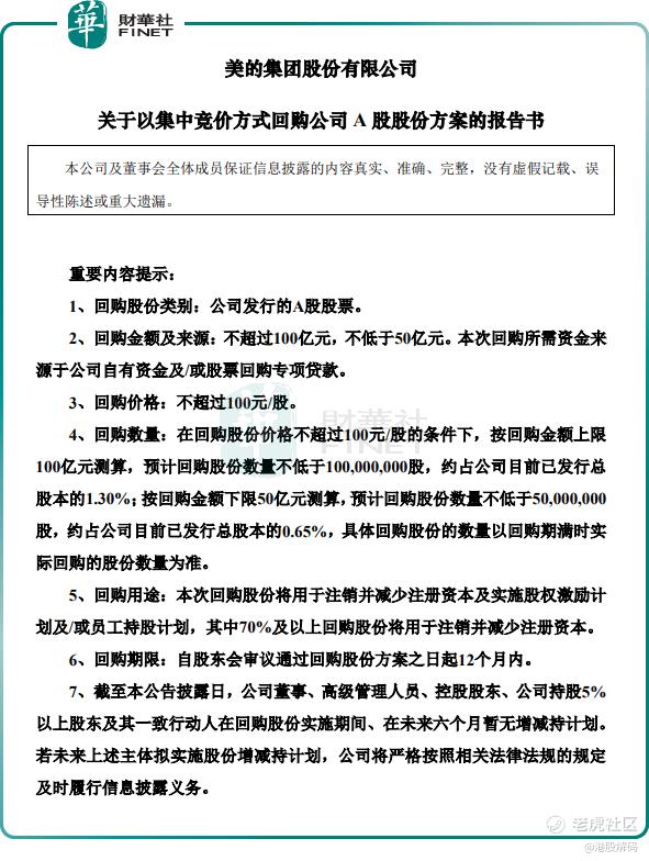今年3月29日,美的集团宣布50亿元至100亿元回购A股股份的初步计划;6月16日,美的正式发布回购公司A股股份方案的报告书。