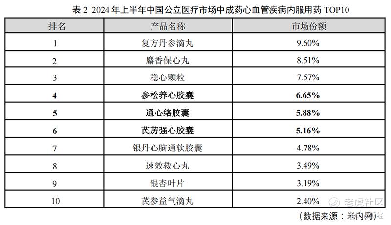 此外,在心脑血管领域,其治疗心血管疾病的独家产品通心络胶囊,早在2000年就月入1.5亿。其和参松养心胶囊、芪苈强心胶囊等三款核心产品,已在中国公立医疗市场中成药心血管疾病内服用药TOP10中稳居第四、五、六位。以岭药业在该领域的市占率从2019年至2024年始终排名全国第一,2024年更是达到13.66%的近六年新高。