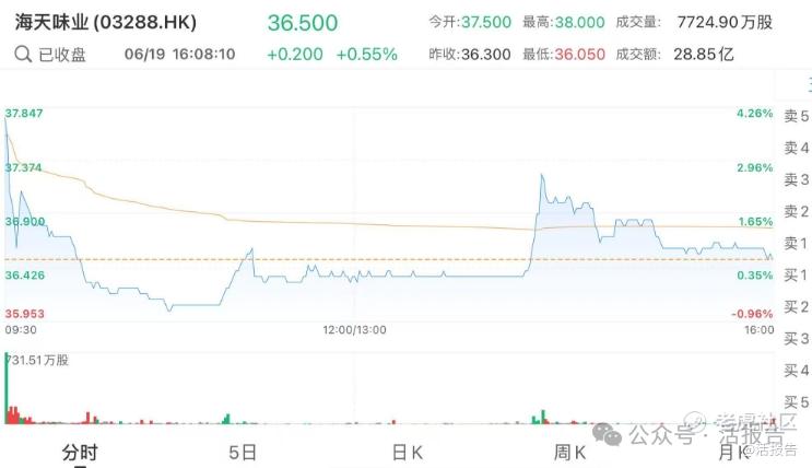 6月19日,海天味业(3288.HK)正式在港交所挂牌上市,联席保荐人中金、高盛、摩根士丹利。上市首日股价一度跌破发行价,最低跌至36.05港元,最终收于36.5港元,股价微涨0.55%,全天成交额超28.85亿(位列全港第8),最新总市值约2131亿港元(较A股折价约13%)。