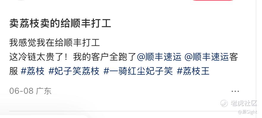而在社交平台上,也有不少销售荔枝的果农发帖,称快递费用过高,自己在“给顺丰打工”。