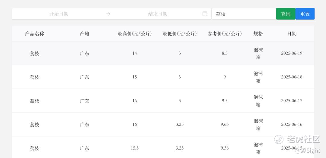 广州江南果蔬批发市场数据显示,截至6月18日,广东所产荔枝参考售价为8.5元/公斤,最高价14元/公斤,最低价3元/公斤。而在5月23日,广东、海南、广西荔枝参考售价为12.75元/公斤,最高价16.5元/公斤,最低价9元/公斤。