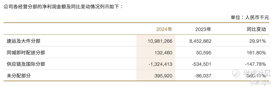 2024年,顺丰速运及大件分部净利润为109.81亿元,同期增长29.91%;同城即时配送分部2024年净利润约为1.32亿元,较2023年同期增长161.80%;供应链及国际分部2024年净亏损约13.24亿元。