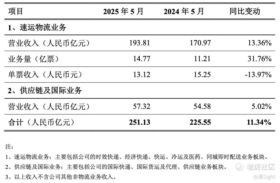 另据6月19日顺丰披露的2025年5月快递物流业务经营简报,速运物流业务、供应链及国际业务合计收入为251.13亿元,同比增长11.34%。其中,速运物流业务收入同比增长13.36%,业务量同比增长31.76%;供应链及国际业务收入同比增长5.02%。
