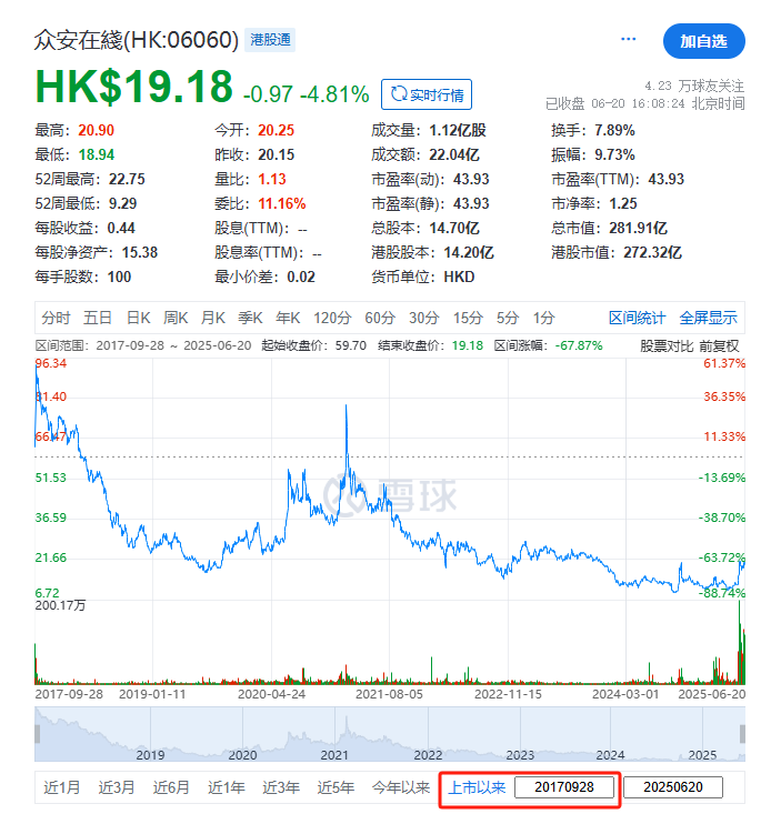 每股作价较众安在线周四(6月19日)收市价20.15港元折让约3.8%,该股今日(6月20日)收报19.18港元,跌0.97元或4.8%。