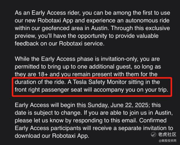 原因是 $特斯拉(TSLA)$ 会在车辆前排配备“安全监控员”,全程陪同乘车。这也与马斯克今年以来的多次表述相悖。今年1月时,马斯克曾表示公司将在夏天推出无人监督的自动驾驶服务,特别强调“车内不配备任何人员”。