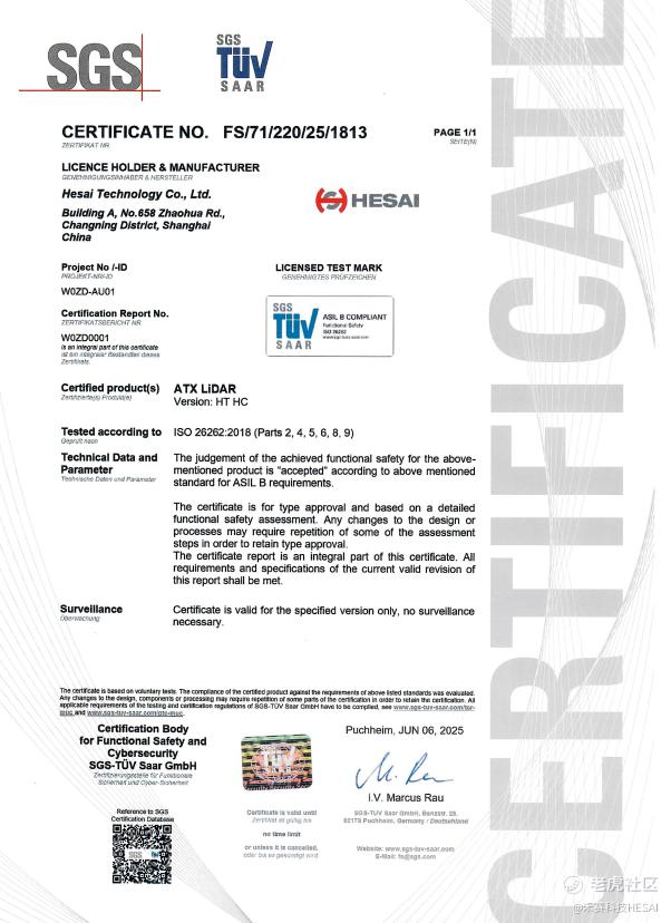 禾赛科技获颁 SGS-TÜV ISO 26262 功能安全产品认证证书