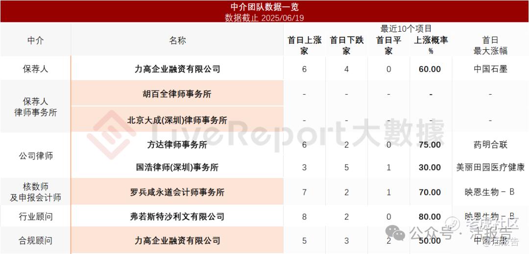 据LiveReport大数据统计,祥康控股中介团队共计11家,其中保荐人2家,保荐项目数据表现较好;公司律师共计5家,综合项目数据一般。整体而言中介团队历史数据表现一般。