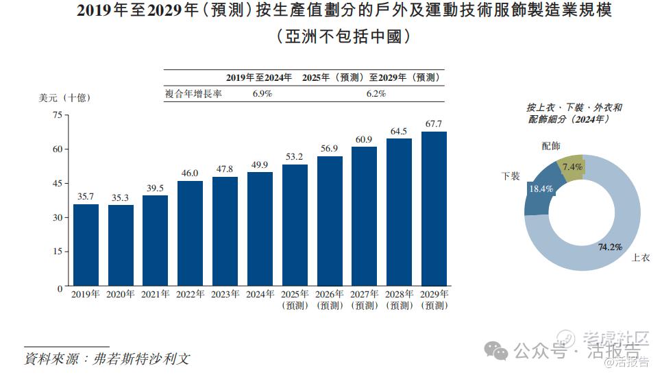 亚洲(不包括中国)的户外及运动技术服饰制造业稳健增长,从2019年的357亿美元增长到2024年的499亿美元,复合年增长率为6.9%。计增长趋势将延续,到2029年市场规模将达到677亿美元,从2025年至2029年保持稳定的6.2%复合年增长率。