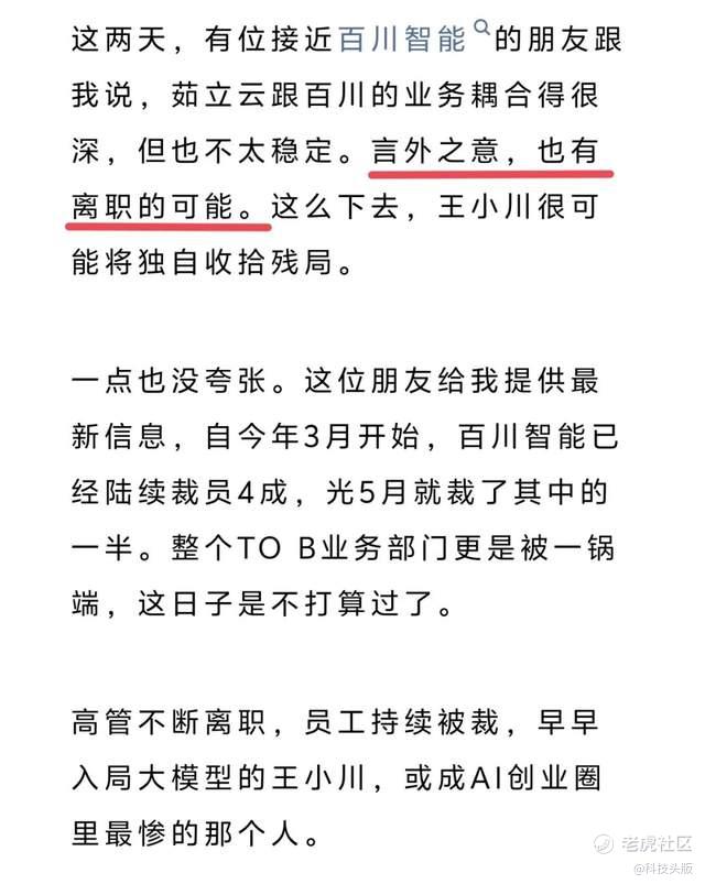 而据接近百川智能的消息人士透露,茹立云的留任意愿似乎也并不稳定。若此消息属实,将意味着创始人王小川不得不独自扛起公司管理与业务推进的重任,曾经星光熠熠的团队或将只剩他一人孤军奋战。
